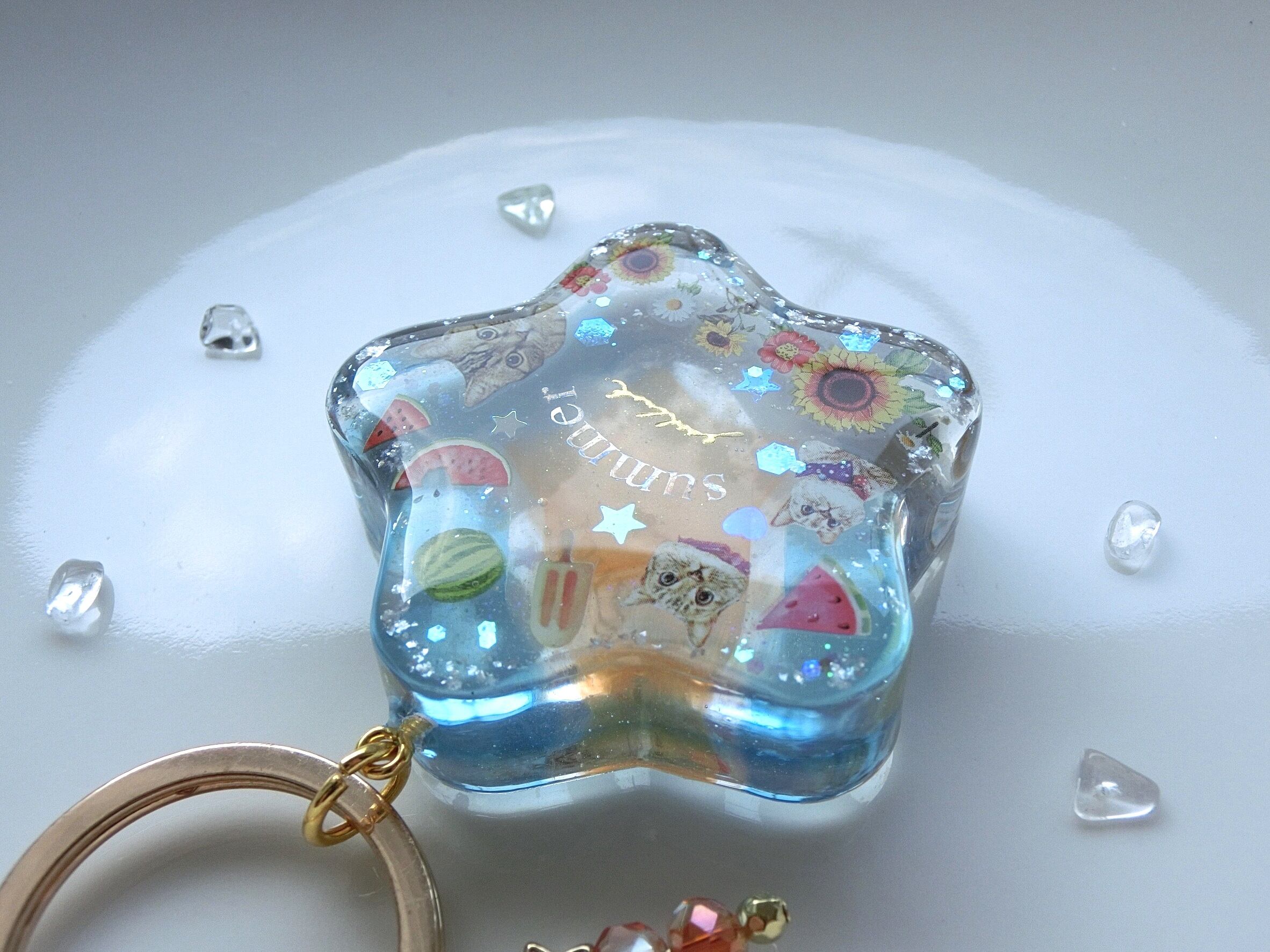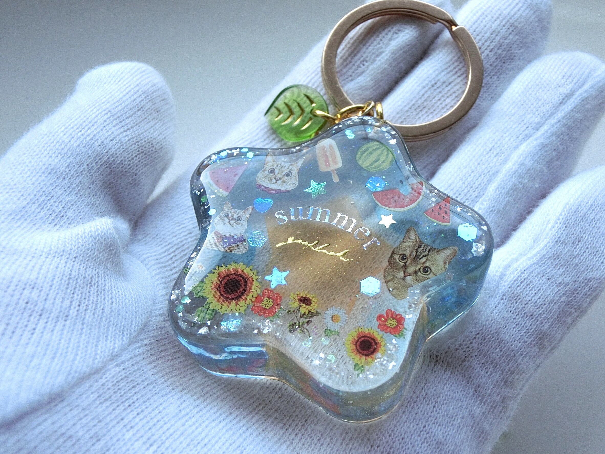 夏を感じるスイカ、ひまわり、アイスとにゃんこさんが共演する星型キーホルダーです。
