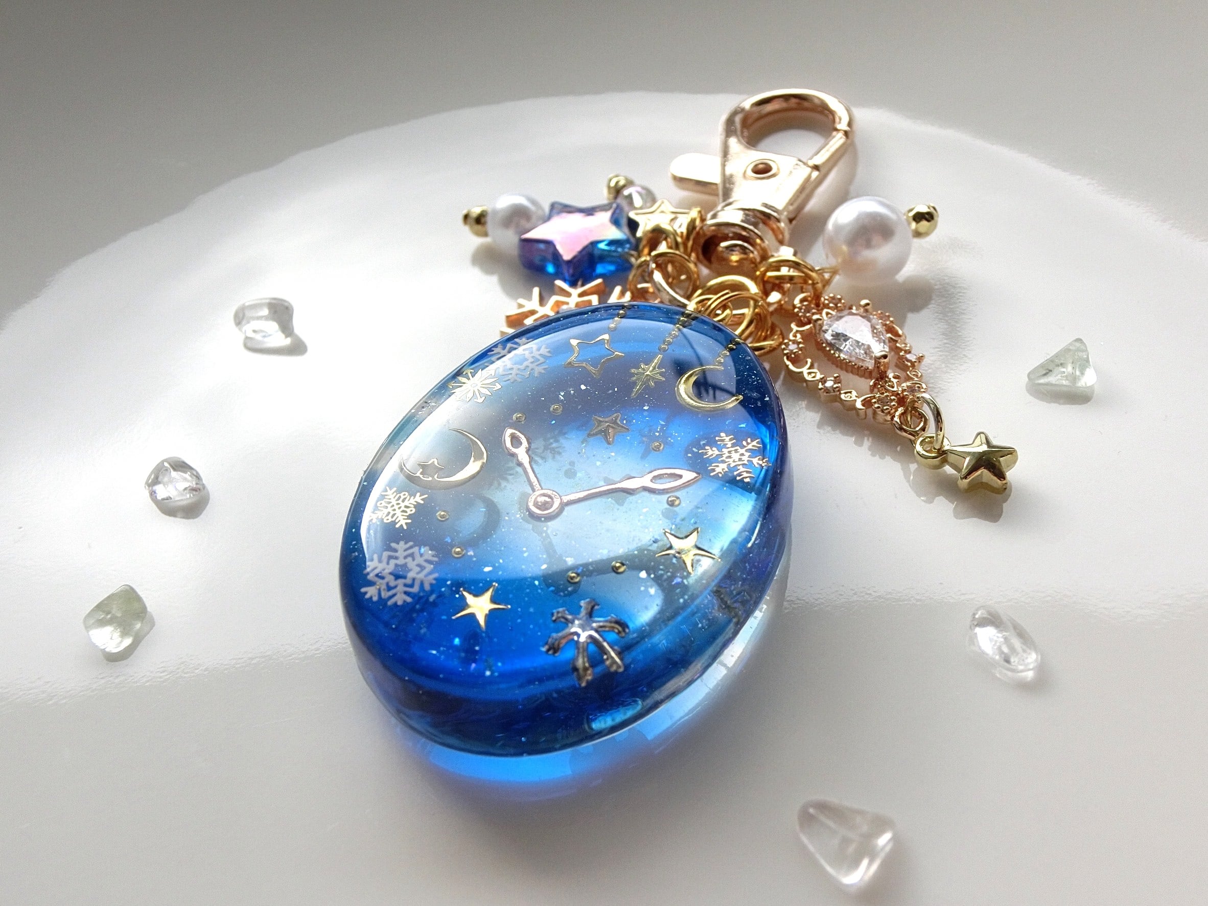 [青グラデ雪]星空時計のオーバルキーホルダー
