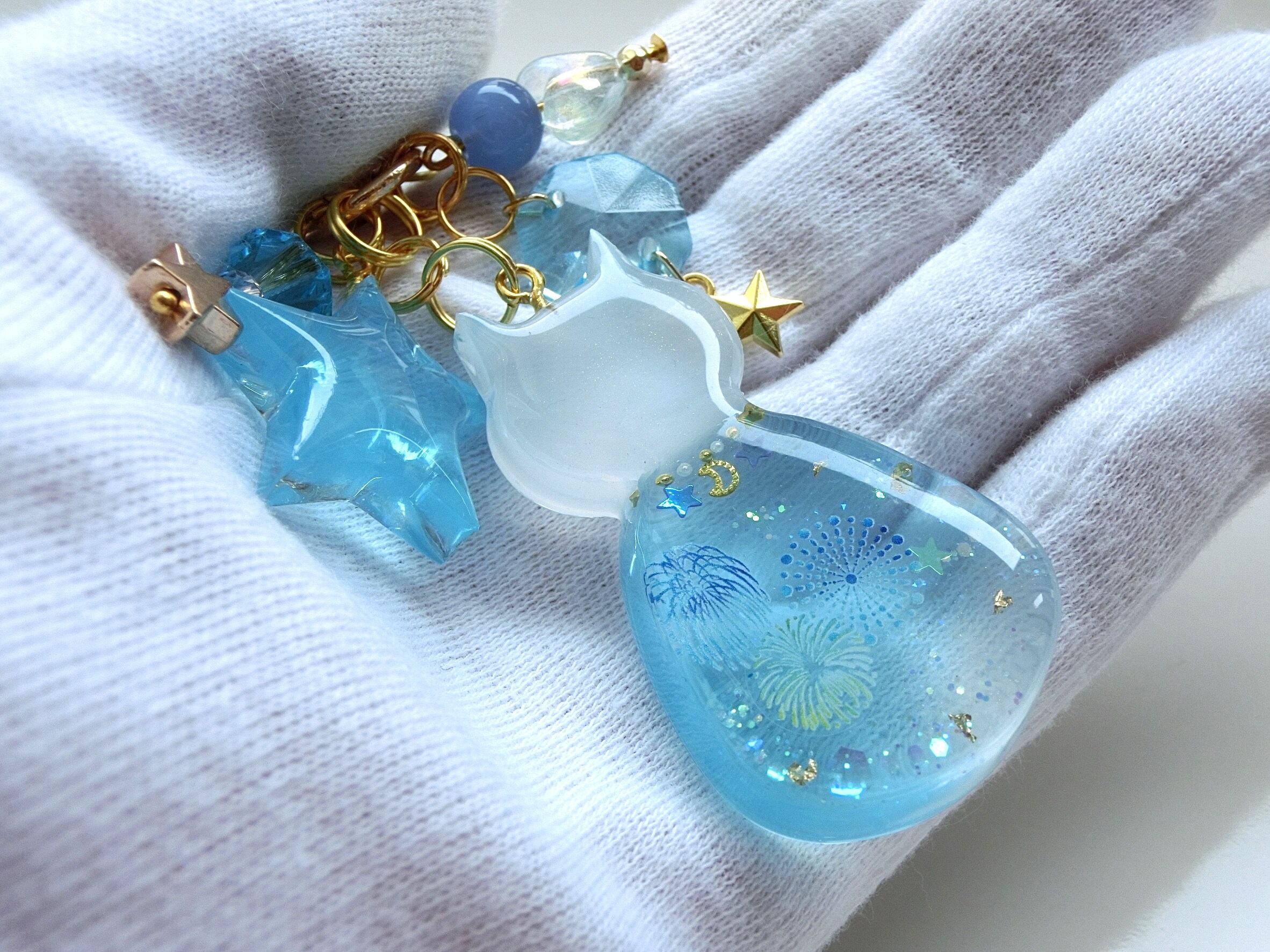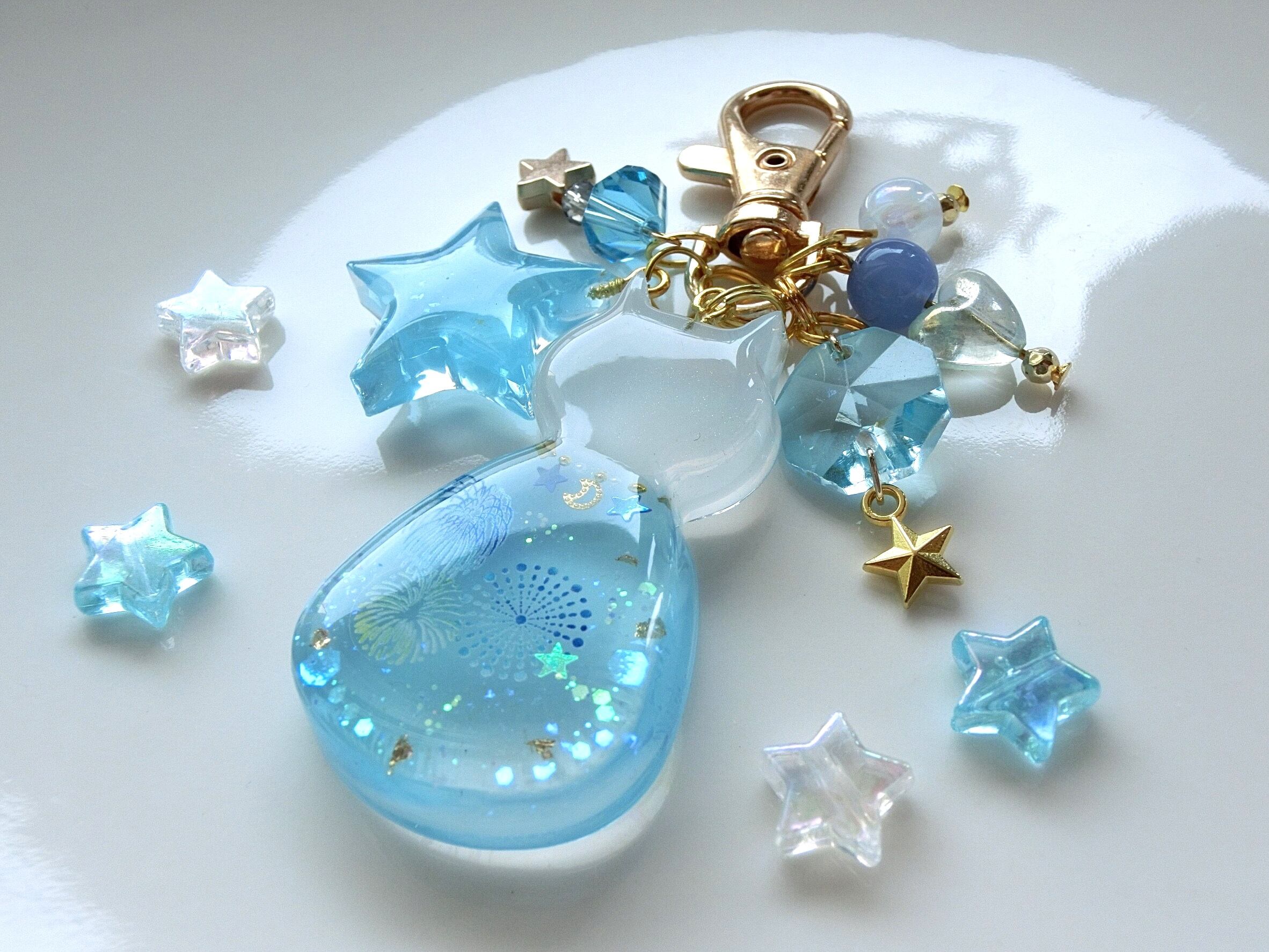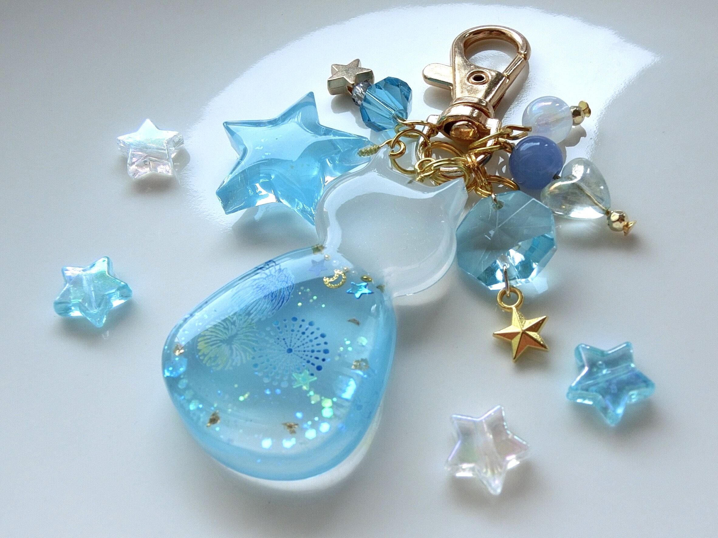 オーロラ色のホログラムやラメを数種類封入し、キラキラ星空に花火が打ち上がる夜空を作りました。