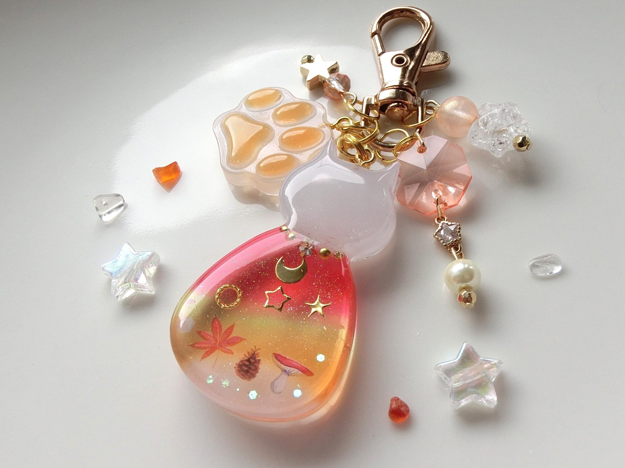 赤、オレンジ、イエローで落ち葉やきのこを入れ秋を感じる猫ちゃん型キーホルダーを作成しました。