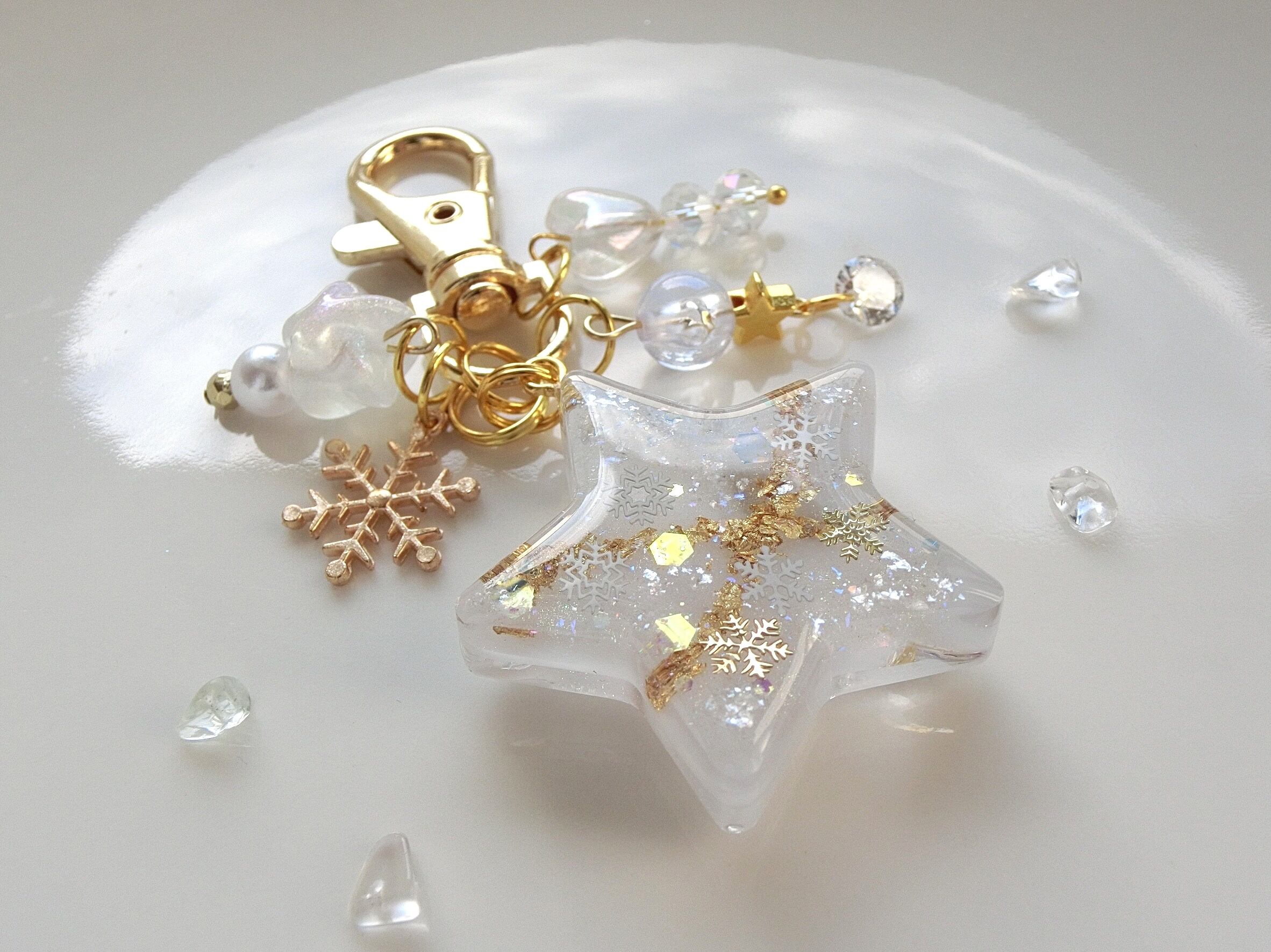 金の箔や、雪の結晶、ホログラムや数種のラメなどの飾り付けがライトアップしたようにキラキラと見えます。